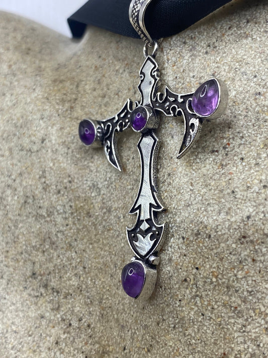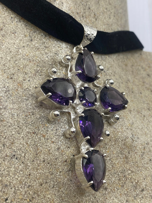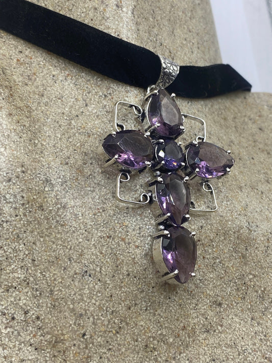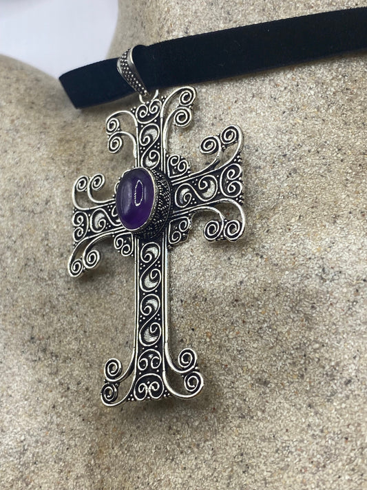 Bohemian Cut Deep Purple Genuine Amethyst Cross Choker Necklace