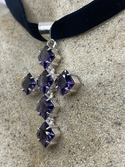 Vintage Purple Amethyst Glass Cross Choker Necklace