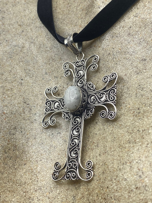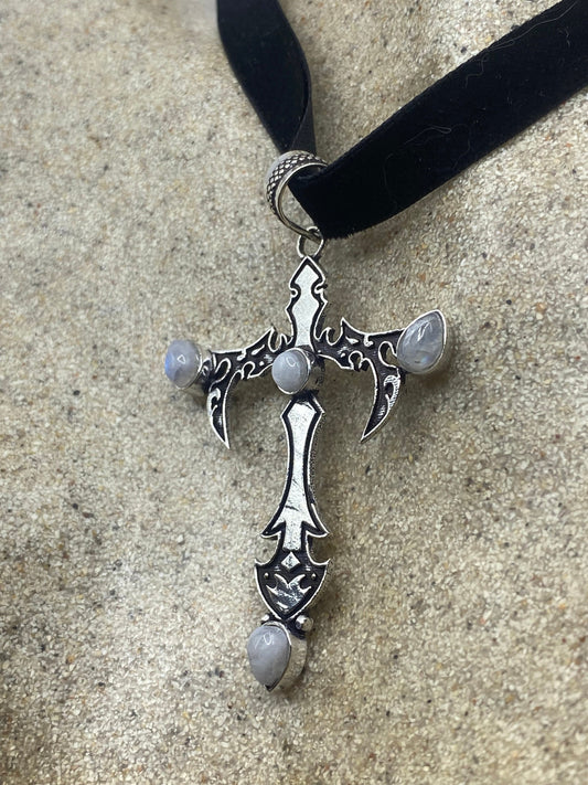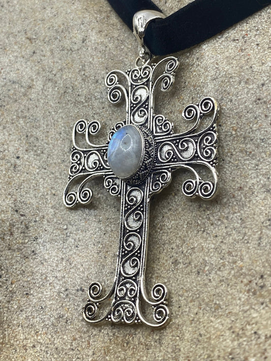 Bohemian Genuine Rainbow Moonstone Cross Choker Necklace