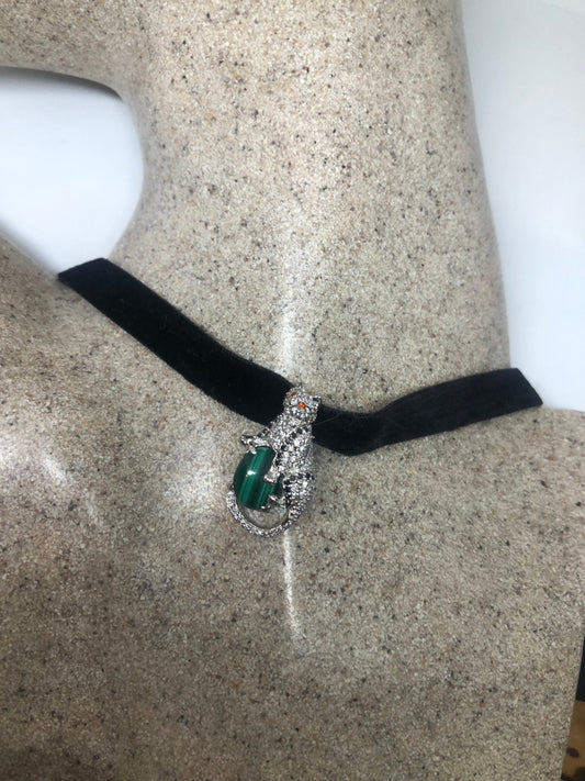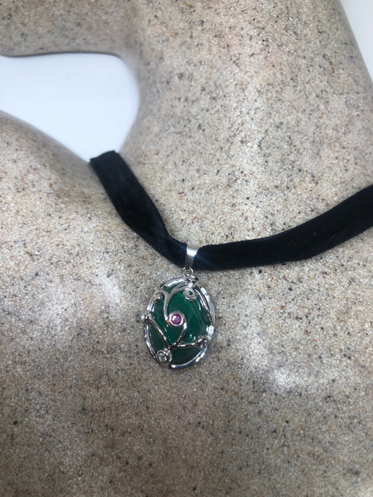 Vintage malachite Choker Deco Ruby 925 Sterling Silver Necklace