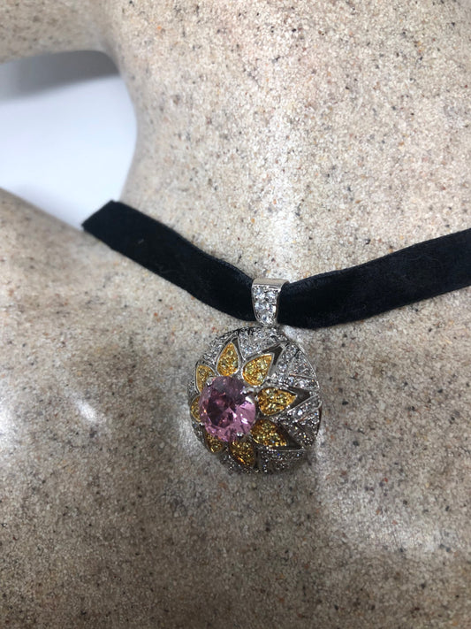 Vintage Pink CZ Choker Sterling Silver Citrine Pendant Necklace