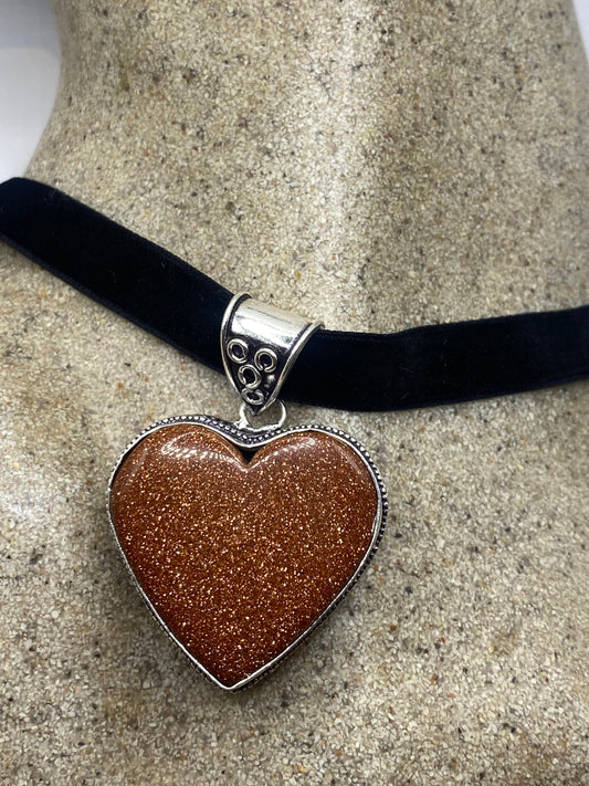 Vintage Golden Sandstone Heart Choker Goldstone Silver Necklace