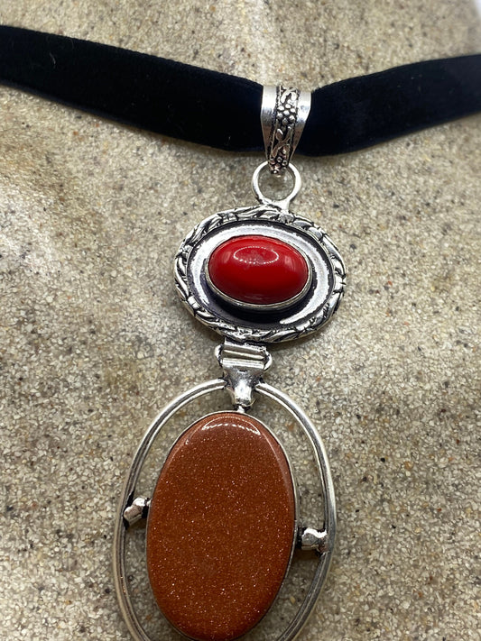 Vintage Golden Sandstone Red Coral Choker Goldstone Silver Necklace