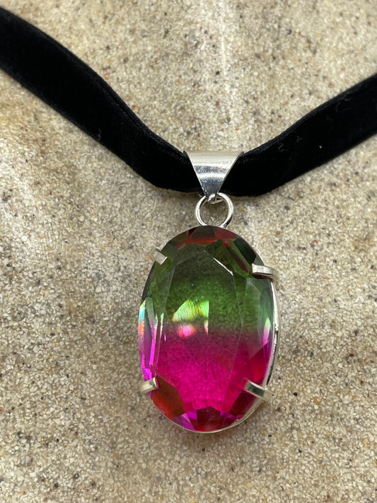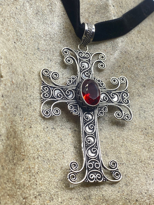 Vintage Red Ruby Glass Cross Choker Black Velvet Necklace.