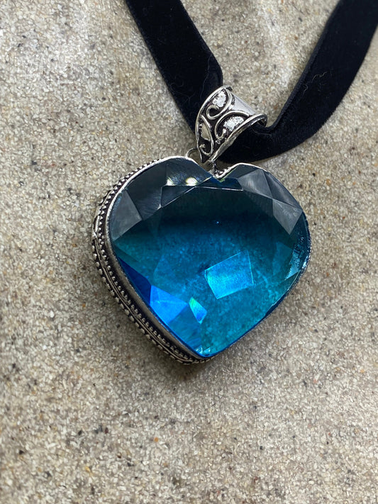Vintage Heart Antique Aqua Blue Glass Choker Necklace