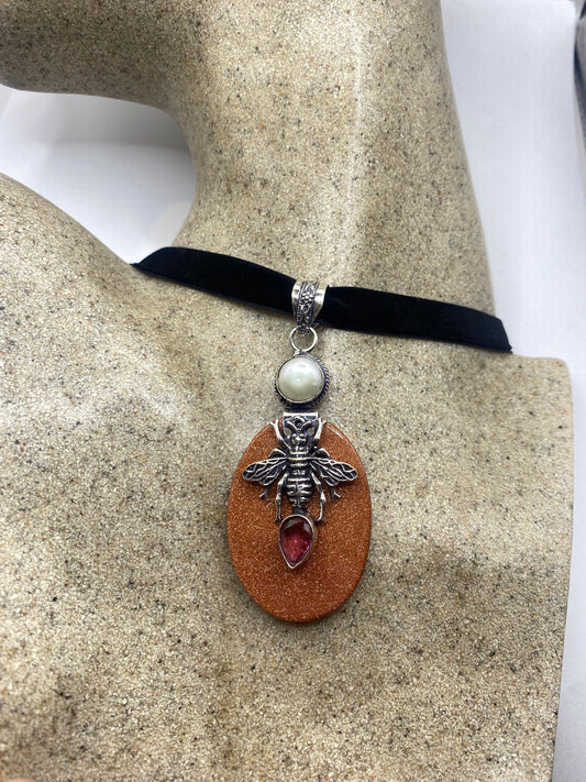 Vintage Golden Sandstone Red Garnet Honeybee Choker Goldstone Silver Necklace
