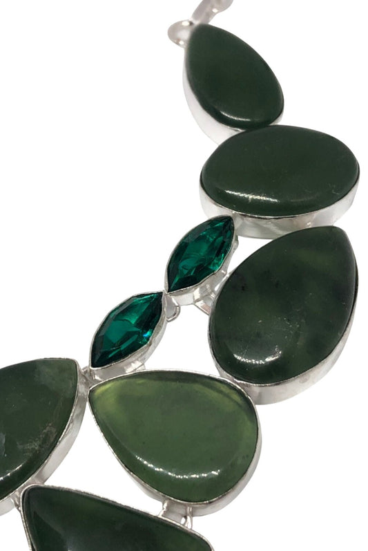 Green Handmade Gothic Styled Silver Finished Genuine Facetted Antique Glass and Nephrite Jade Collar Bib Necklace