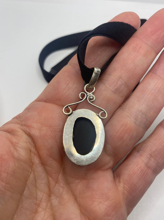 Vintage Silver Genuine Black Onyx Dangle Pendant Necklace