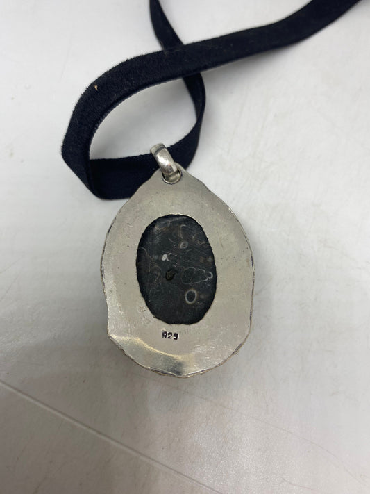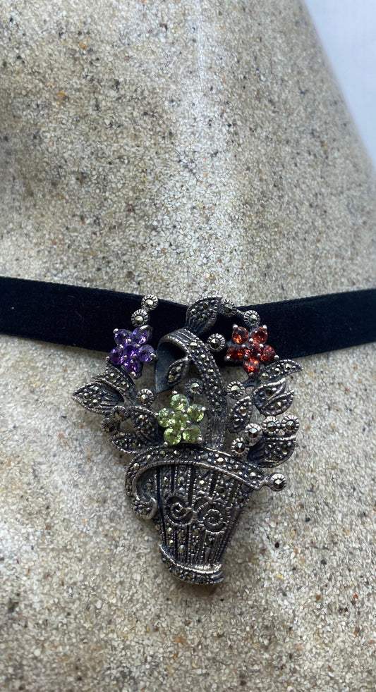 Vintage Gemstone Basket Choker 925 Sterling Silver Marcasite Pendant Necklace