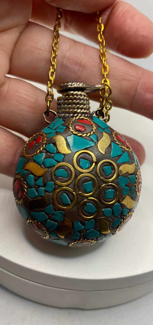 perfume oil bronze bottle handmade vintage mosaic gemstone pendant necklace