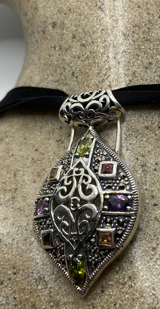 Vintage Marcasite Black Velvet Choker 925 Sterling Silver Deco Pendant Necklace