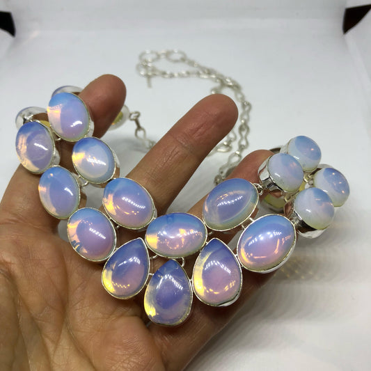 Vintage Opal milk glsss Silver collar Necklace Choker