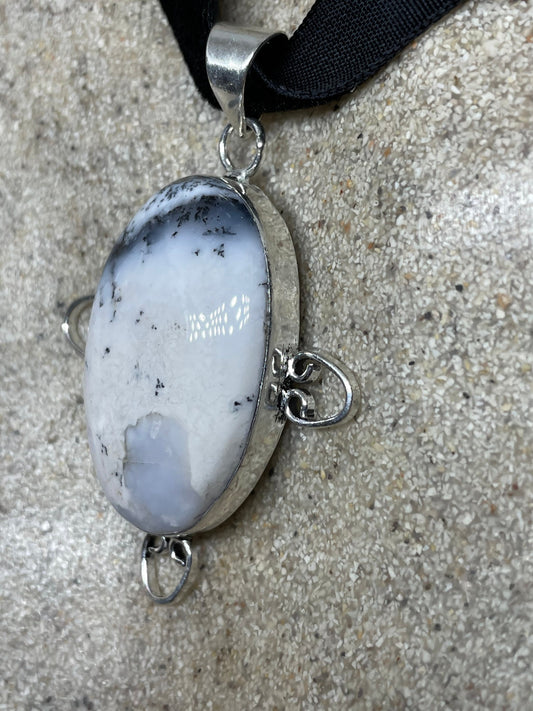 Vintage Silver Genuine Banded White Onyx agate Choker Pendant Necklace