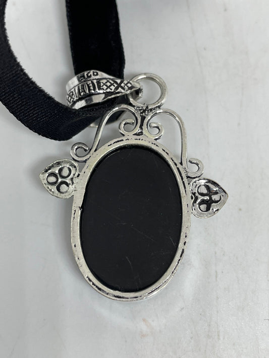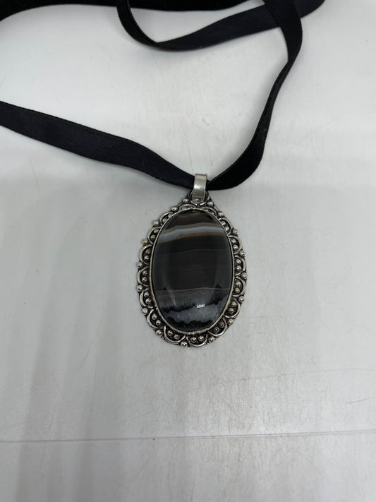 Vintage Silver Genuine Banded Black Onyx Agate Choker Black Velvet Ribbon Pendant Necklace