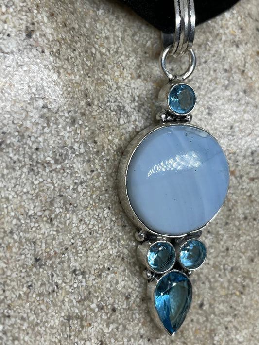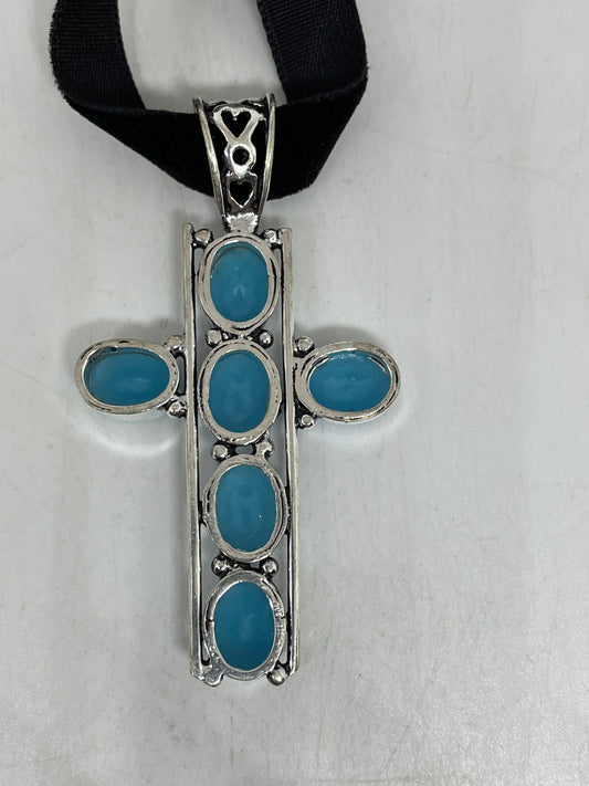 Vintage Blue Chalcedony Cross Choker White Bronze Pendant Necklace