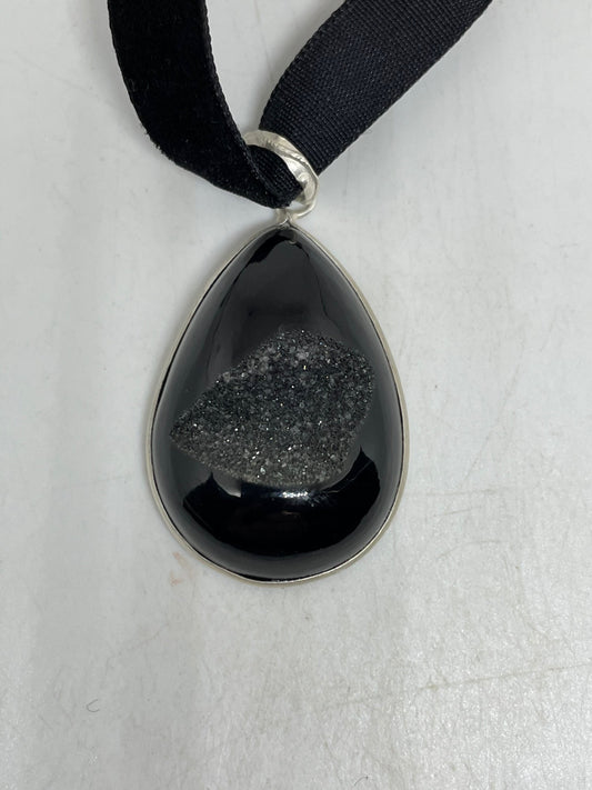Vintage Silver Genuine Black Onyx druzy Dangle Pendant Necklace