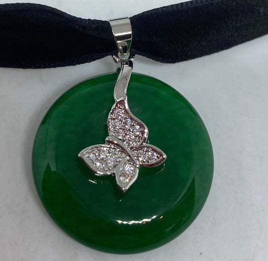 Vintage Green Jade Silver Finish Mariposa Butterfly Necklace