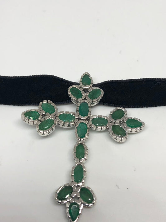 Vintage Green Emerald Choker 925 Sterling Silver Cross Pendant Necklace Velvet Choker