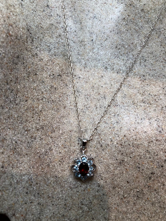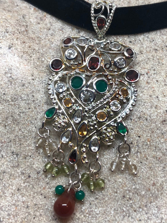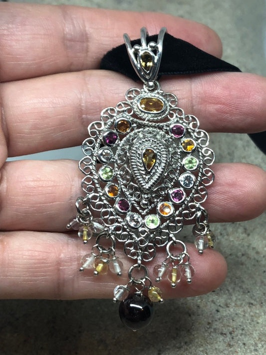 Vintage Handmade 925 Sterling Silver Genuine Garnet, Mixed Gemstone and Citrine Antique Pendant Necklace