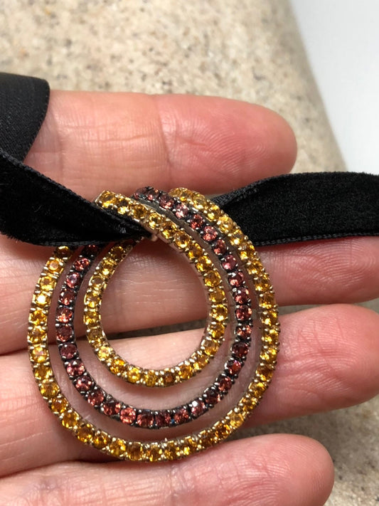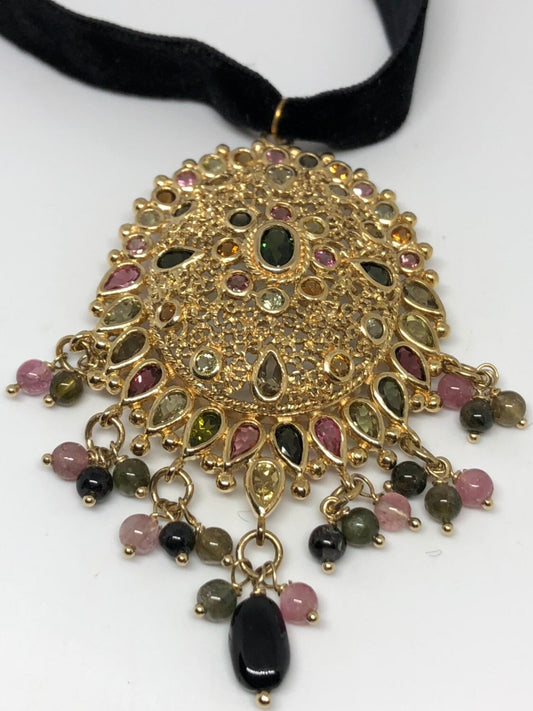 Vintage Handmade Golden 925 Sterling Silver Genuine Garnet, tourmaline and Citrine Antique Pendant Necklace