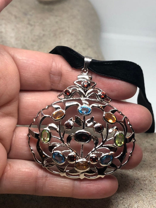 Vintage Handmade 925 Sterling Silver Genuine Mixed color gemstomes Antique Pendant Necklace