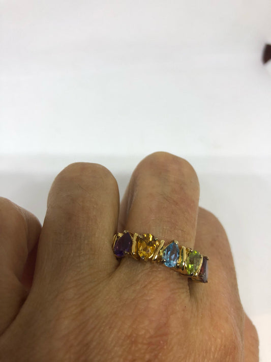 Vintage mixed genuine gemstones golden 925 Sterling Silver band Ring
