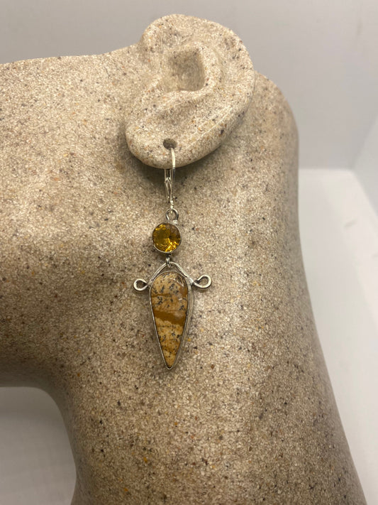 Vintage Citrine Picture Jasper Slice 925 Sterling Silver Lever Back Earrings