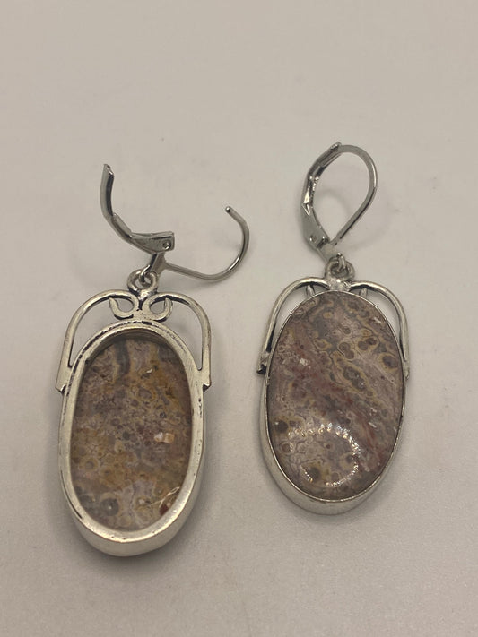 Vintage Picture Jasper Slice 925 Sterling Silver Lever Back Earrings