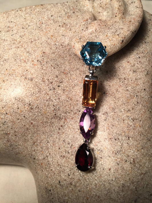 Vintage Genuine Citrine Blue Topaz Garnet and Amethyst Gemstone 925 Sterling Silver Deco Dangle Earrings