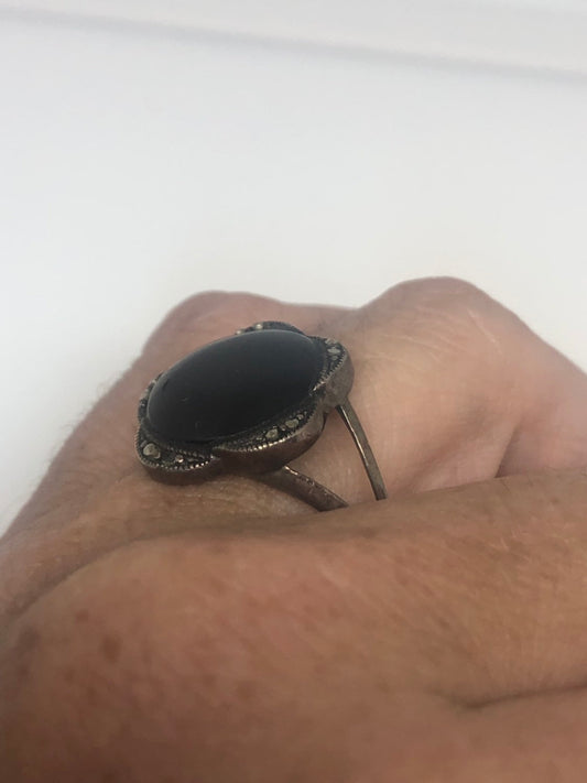 Vintage Genuine Black Onyx Silver Marcasite Ring Size 8