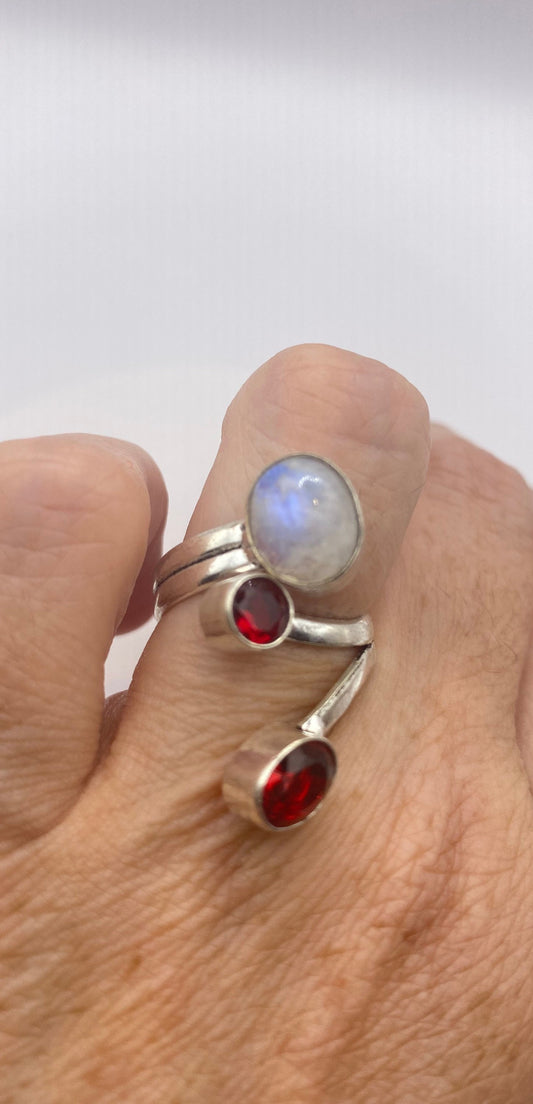 Vintage Genuine Blue White Rainbow Moonstone Ruby Glass Ring Statement Cocktail Size Adjustable