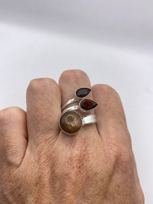 Vintage Genuine Bronze Moonstone Garnet Adjustable Ring