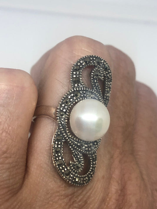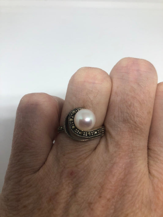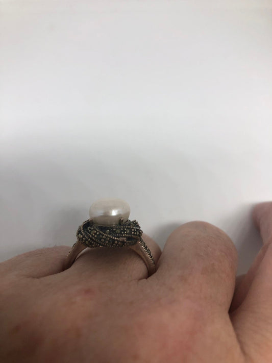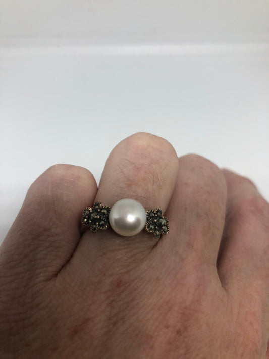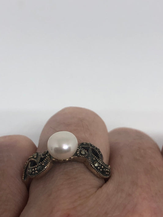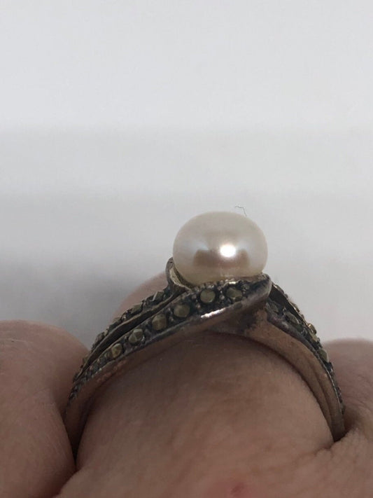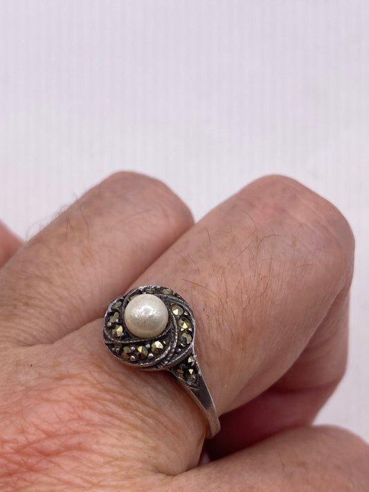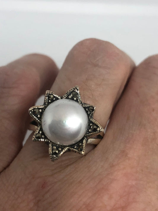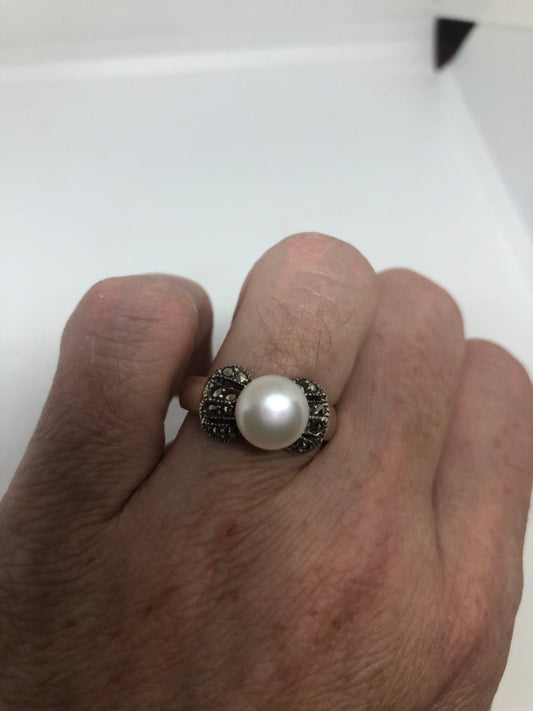 Vintage Genuine Pearl Marcasite 925 Sterling Silver Ring