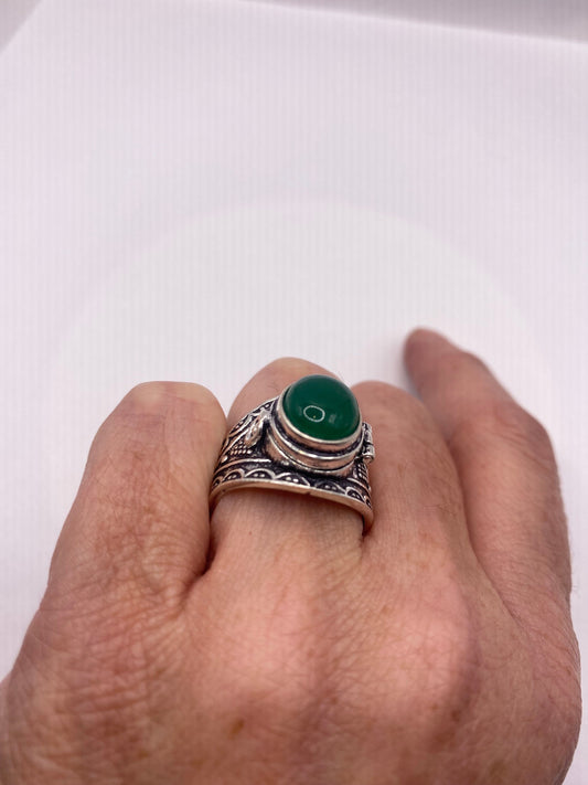 Vintage Green Chrysoprase Brass Poison Pillbox Ring
