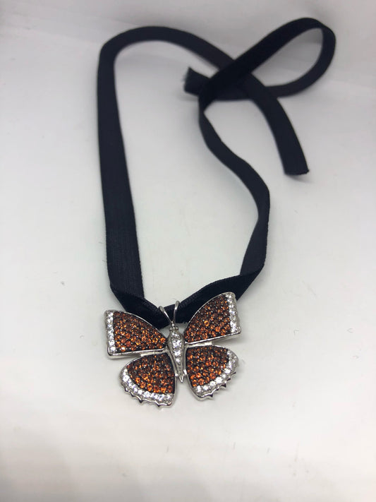 Handmade 925 Sterling Silver Vintage Genuine Orange Garnet Butterfly Choker