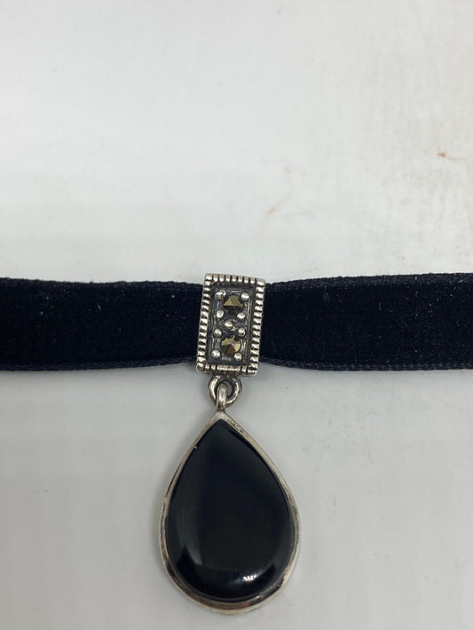 Vintage Marcasite 925 Sterling Silver Genuine Black Onyx Dangle Pendant Necklace