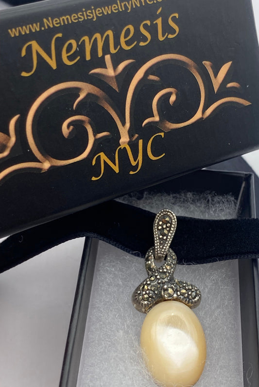 Vintage Marcasite 925 Sterling Silver Mother of Pearl Dangle Pendant Necklace