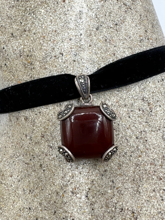 Vintage Marcasite Choker 925 Sterling Silver Deco Carnelian Pendant Necklace