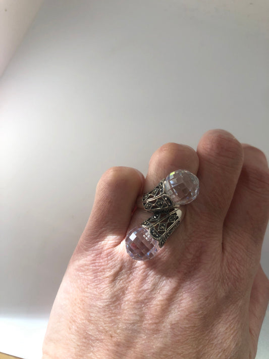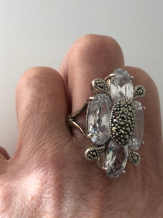 Vintage Marcasite Ring Cubic Zirconia Crystal 925 Sterling Silver Cocktail Statement