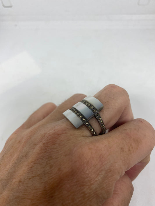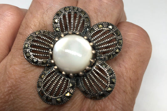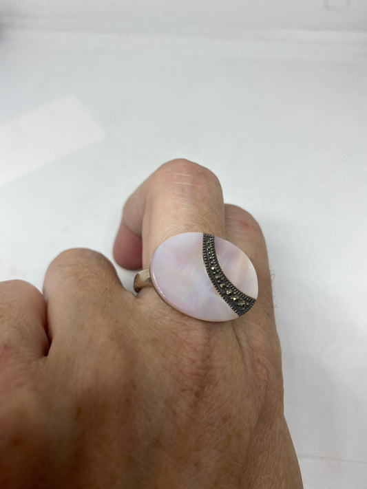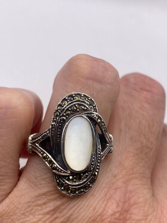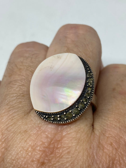 Vintage Marcasite Ring Mother of Pearl 925 Sterling Silver Cocktail Statement Ring