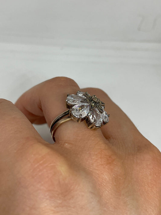 Vintage Marcasite Ring Cubic Zirconia Crystal 925 Sterling Silver Cocktail