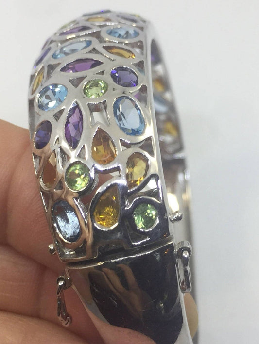 Genuine Mixed Gemstones in 925 Sterling Silver Deco Bangle Bracelet