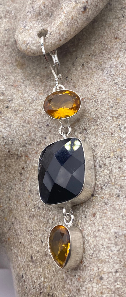 Vintage Black Onyx Citrine Sterling Silver Deco Dangle Earrings