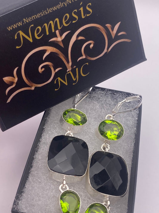 Vintage Black Onyx Peridot Sterling Silver Deco Dangle Earrings