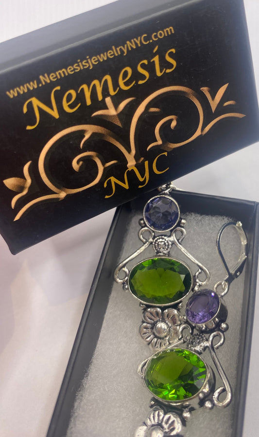 Antique Vintage Green Peridot Amethyst Silver Liver Back Dangle Earrings