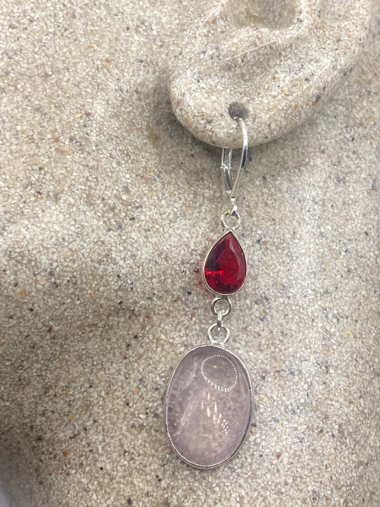 Vintage Red Ruby Glass Rose Quartz Earrings 925 Sterling Silver Leverback