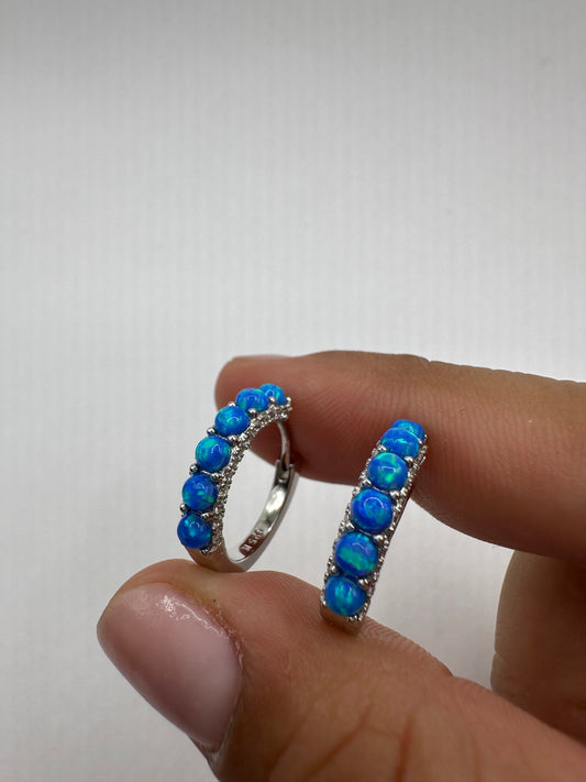 Vintage Blue Opal Earrings White Sapphire 925 Sterling Silver Hoops