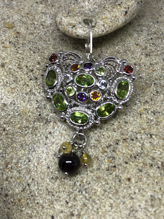 Vintage 925 Sterling Silver Genuine Green Peridot and Mixed Gemstone Heart Earrings
