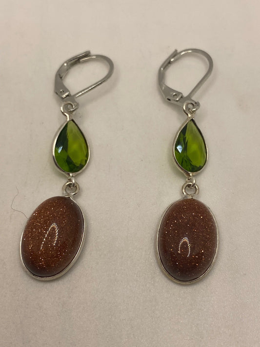 Vintage Chandelier Earrings goldstone Peridot Silver Dangle