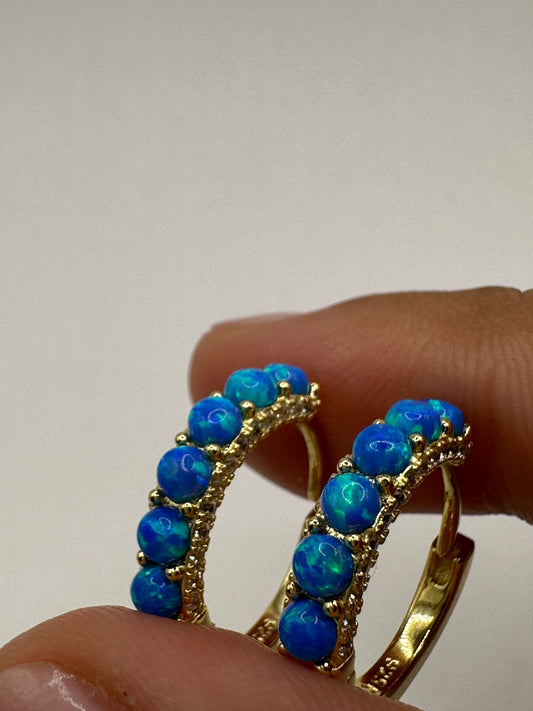 Vintage Blue Opal Earrings White Sapphire golden 925 Sterling Silver Hoops